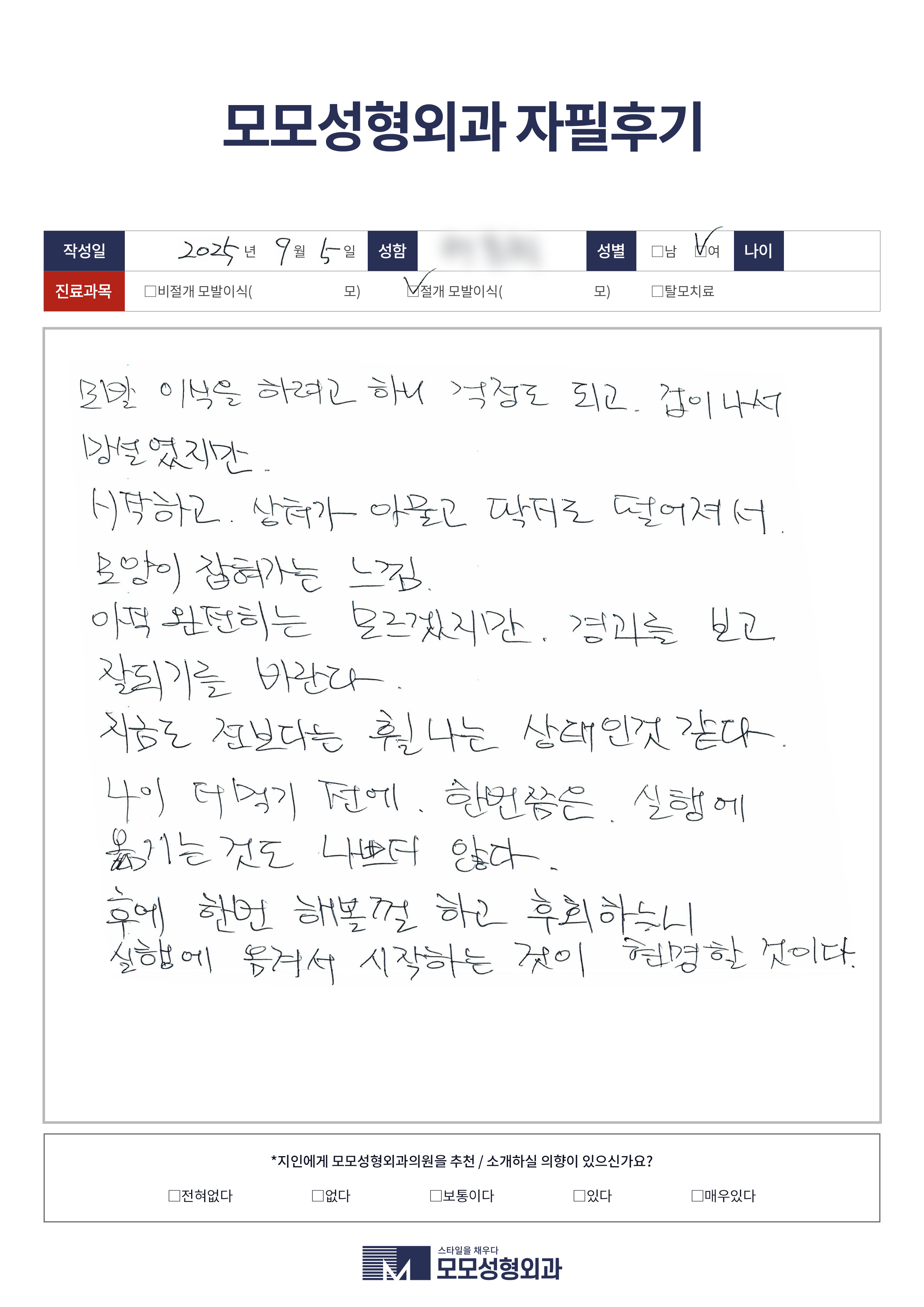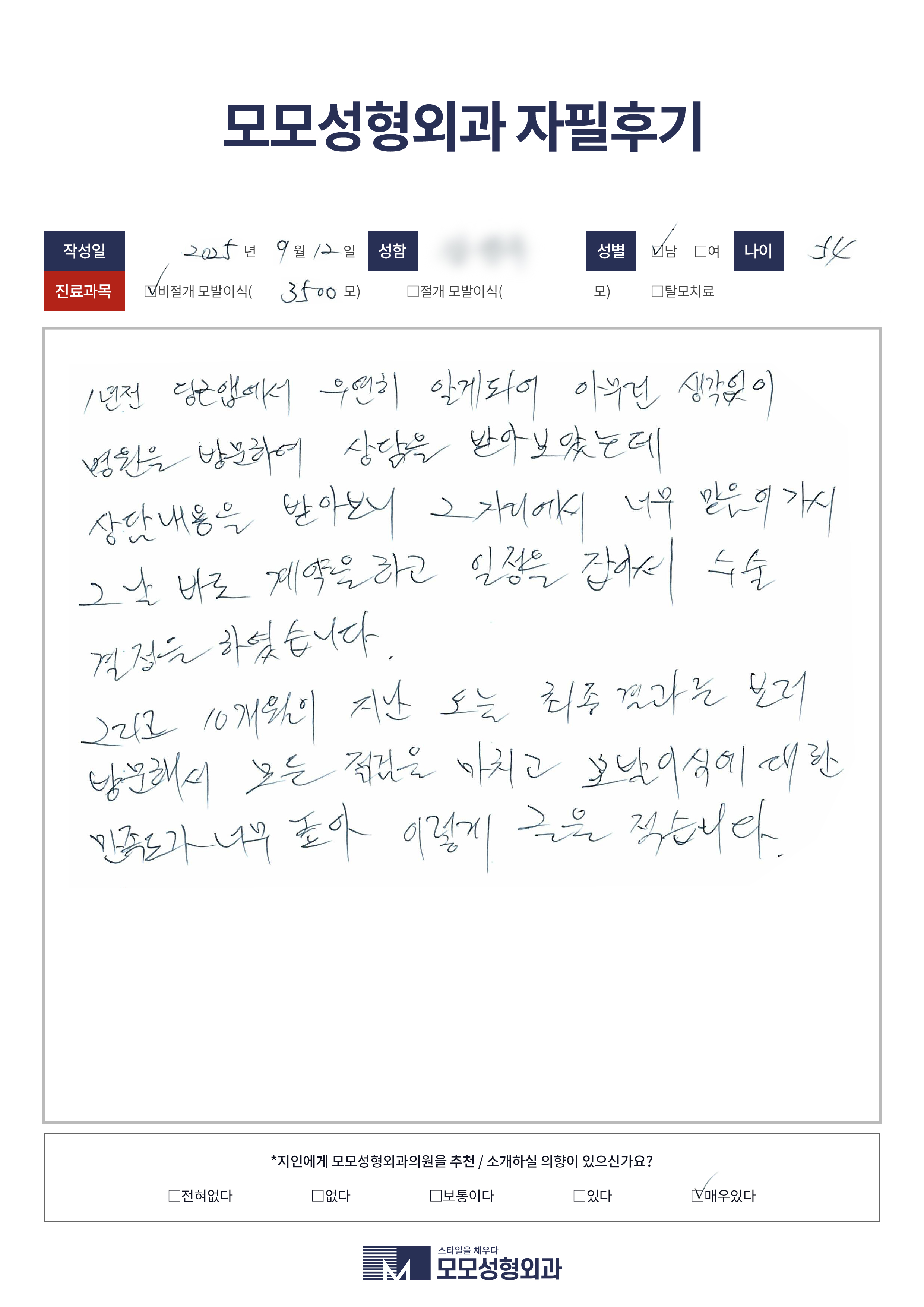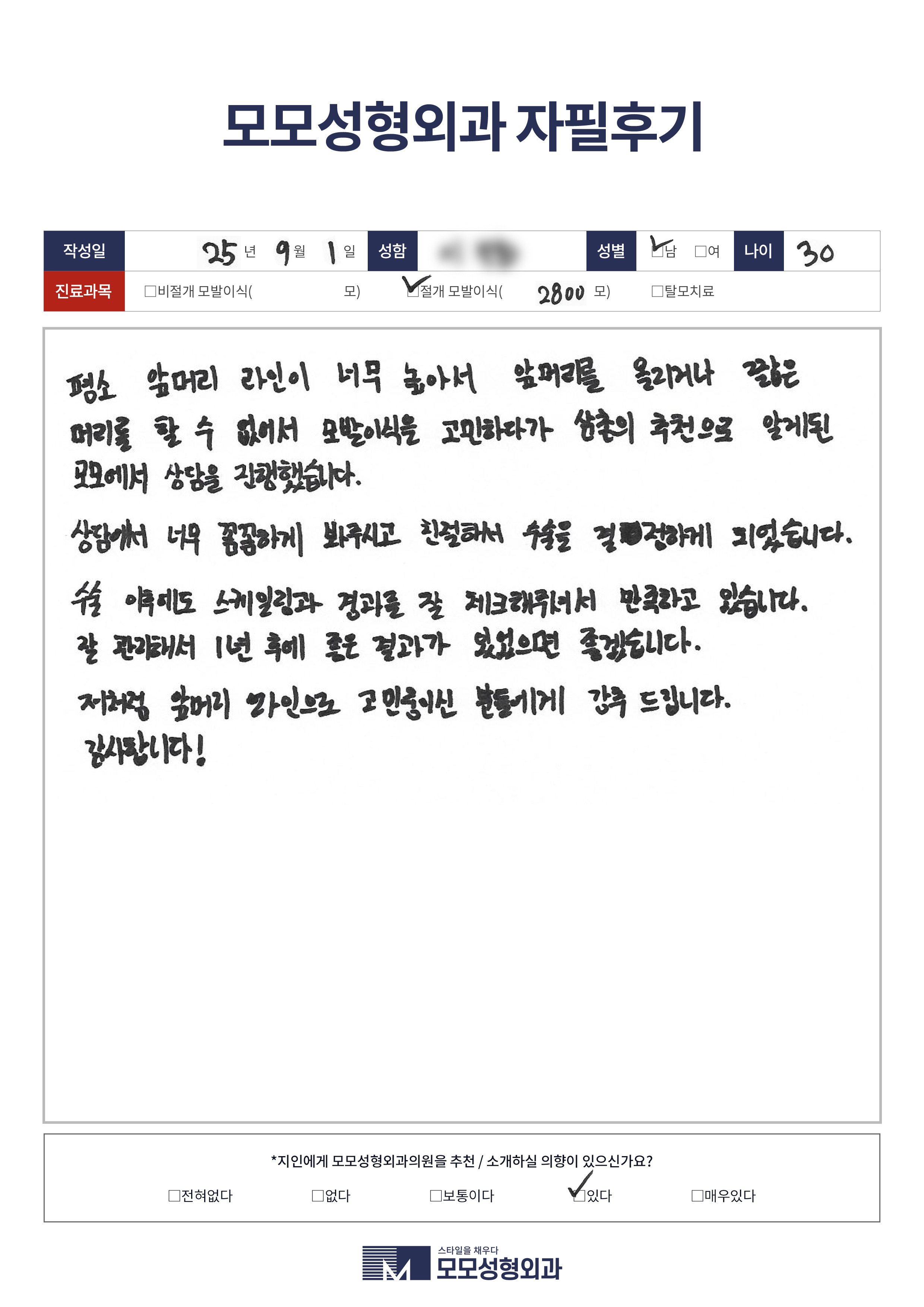 로그인 후에 확인하실 수 있습니다.[30대]비절개모발이식1500모이상, M자이마